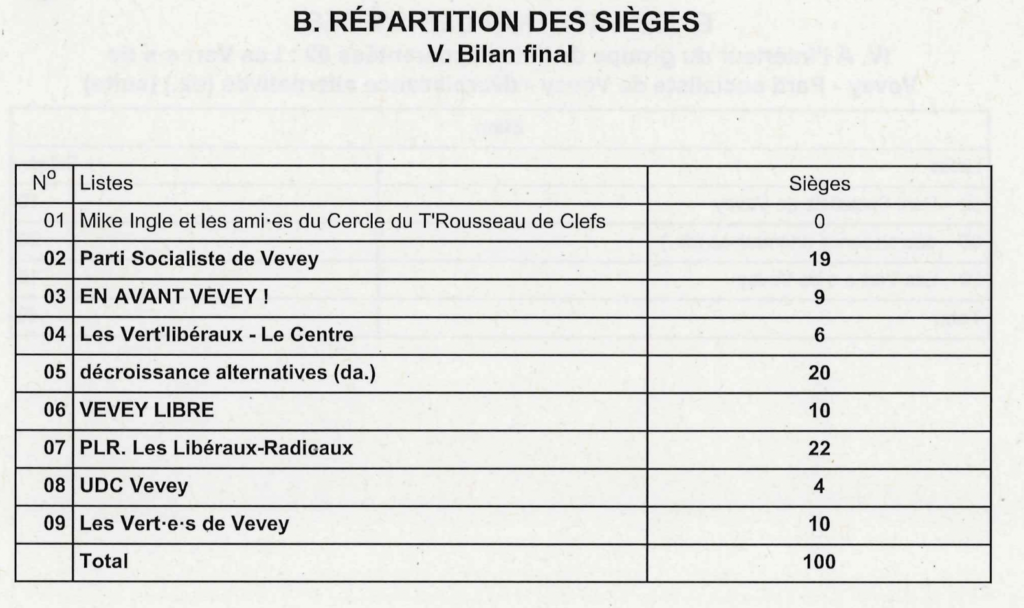 Le résultat est encourageant : Vevey Libre progresse au Conseil communal et gagne un siège, passant de 9 à 10 élus. Un signal positif qui confirme que notre mouvement continue de compter dans le paysage politique veveysan.